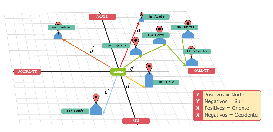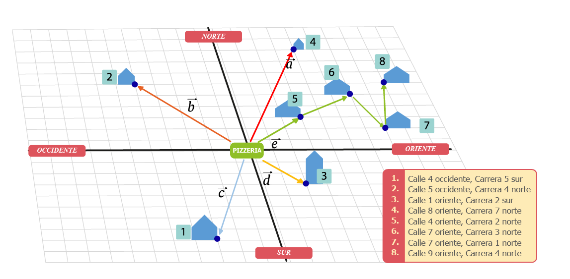 Si en el ejemplo del repartidor de pizza, las paralelas trazadas al eje Y representan las carreras y las paralelas trazadas al eje X las calles, las casas se podrían representar por sus direcciones.