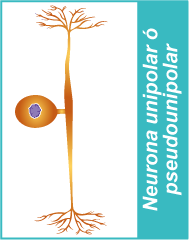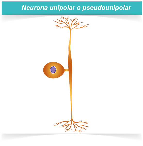 - Se trata de una variación de la neurona bipolar, pero el axón único unido al cuerpo celular tiene dos polos opuestos o direcciones opuestas, una hacia el músculo, articulaciones y piel y la otra hacia la médula espinal.