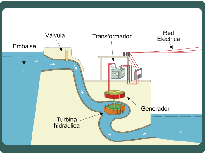 El embalse de la hidroeléctrica posee una cantidad X de agua que se desplaza desde una altura h a una velocidad determinada sobre el canal que conduce al cuarto de máquinas, interaccionando con las aspas del molino conectadas al dinamo con el fin de generar energía eléctrica.